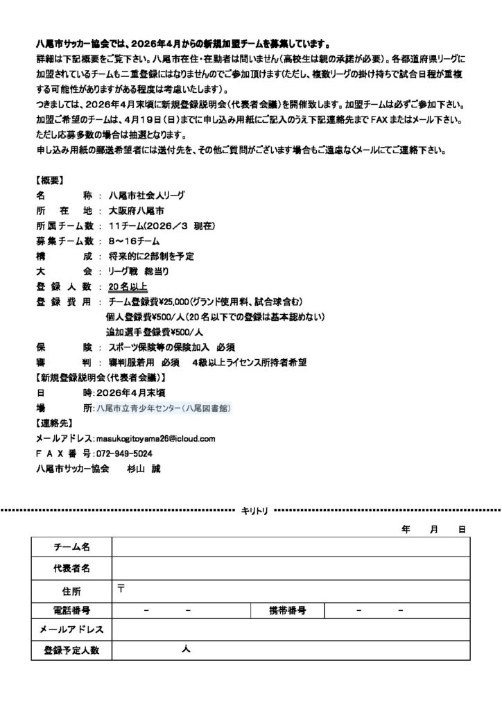 2026.02.13 八尾市社会人リーグ新規加盟チームを募集