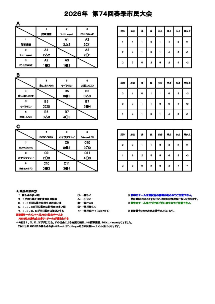 A組はⅠ、Ⅱ、Ⅲ、Ⅳが同じの為、Ⅴの協会による抽選の結果、1位龍華連盟、2位Y.J.H squadとなりました。これにより ABC2位の勝ち点の多い1チームはY.J.H squadとなり決勝トーナメント進出となります。
